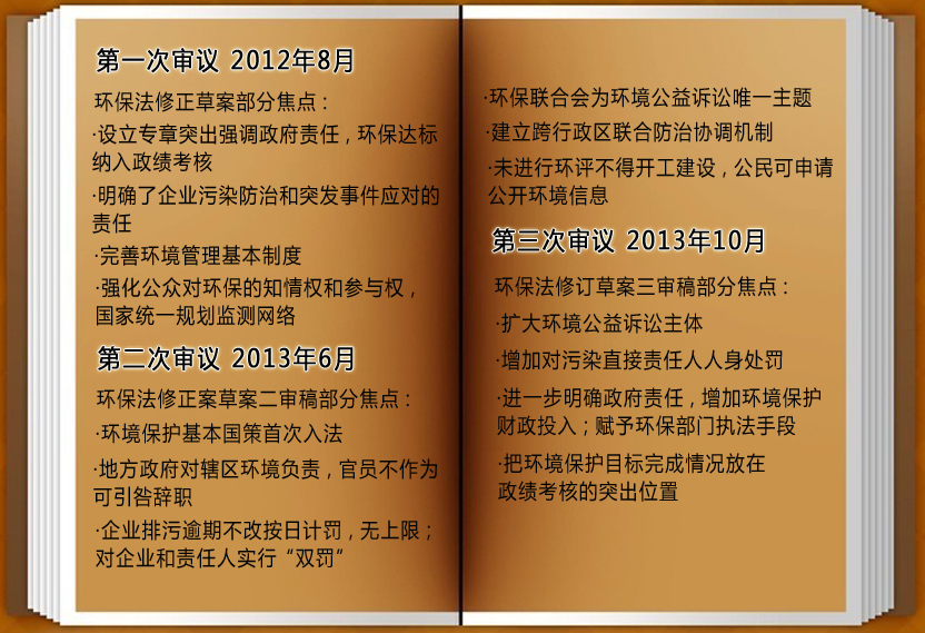 | 现行环境保护?989q开始实施,2012q开始了修改q程。全国h大常委会(x)已对草案q行了三ơ审议,2014q将q行W四ơ审?/span> |