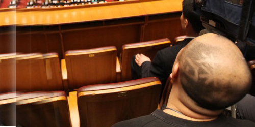 记者顶“梦”字发型人民大会(x)堂内采访 |